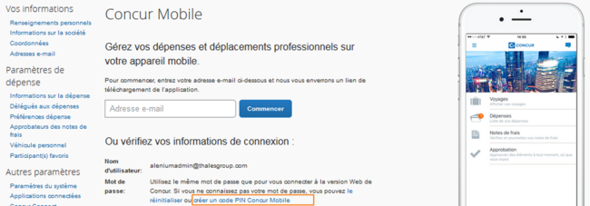 - Etape 4 : Cliquez sur Créer un code PIN Concur Mobile (ne cliquez jamais sur "réinitialiser le mot de passe", le lien ne fonctionne pas avec une connexion SSO)