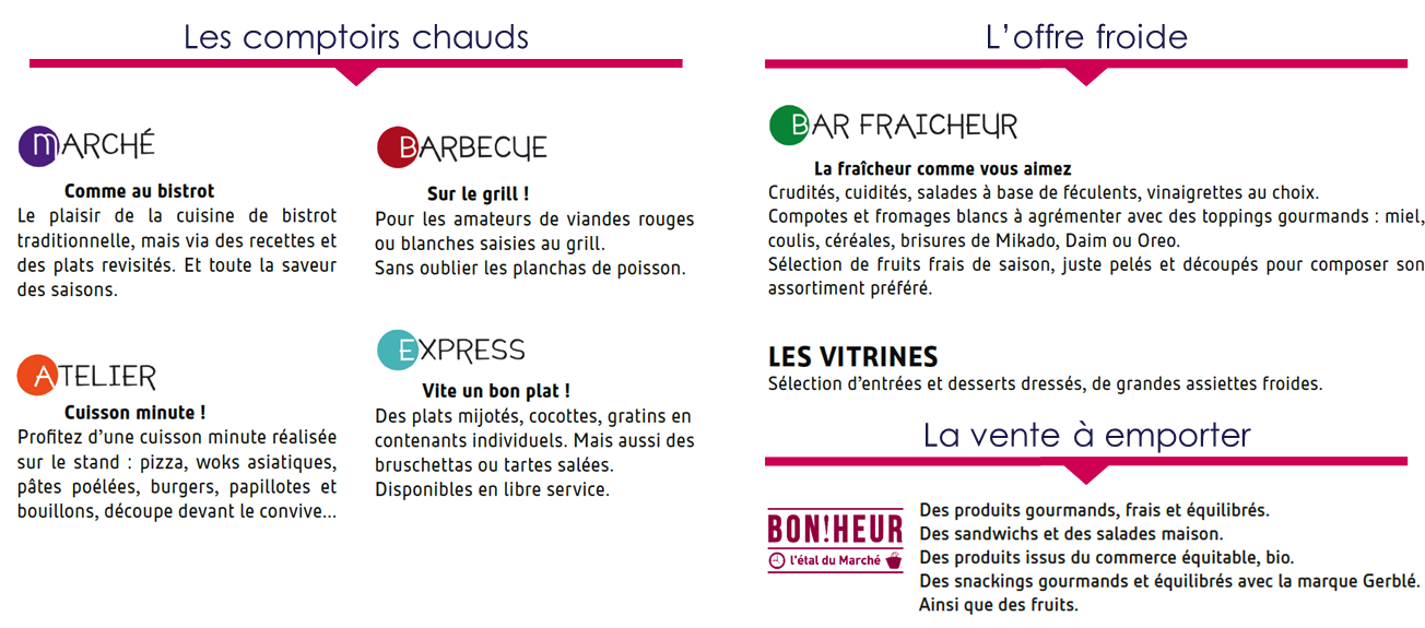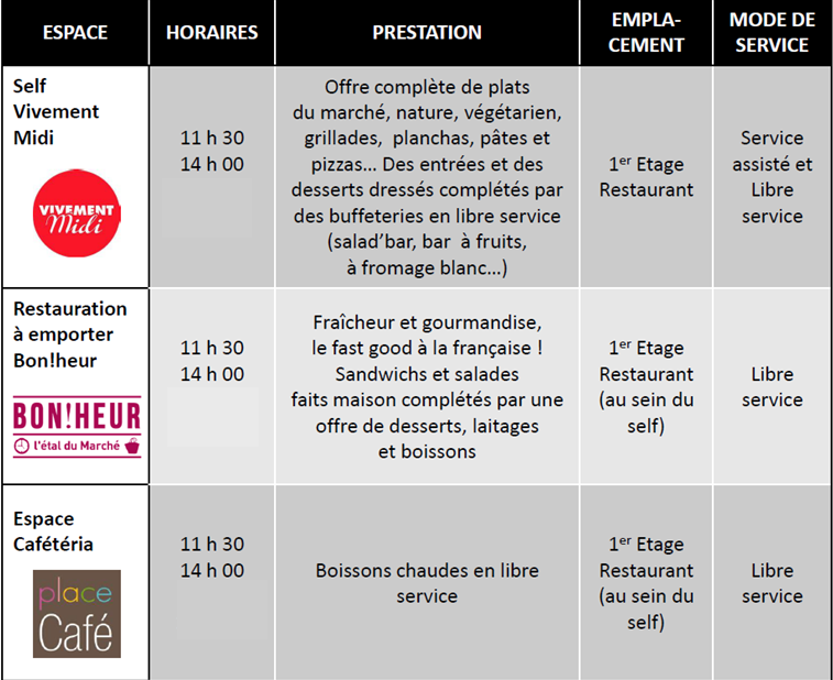 Vous trouverez ci-dessous les différents espaces proposés au sein du self :